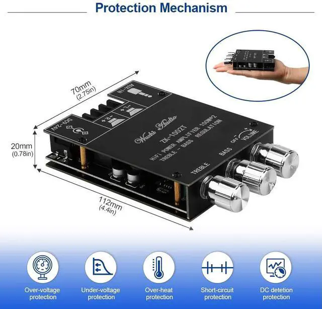 With Protective FunctionThis amplifier module includes over-voltage protection, under-voltage protection, over-heat protection, and short-circuit protection, all housed in a protective case.