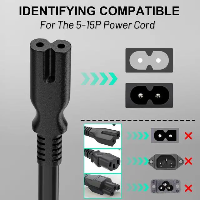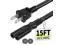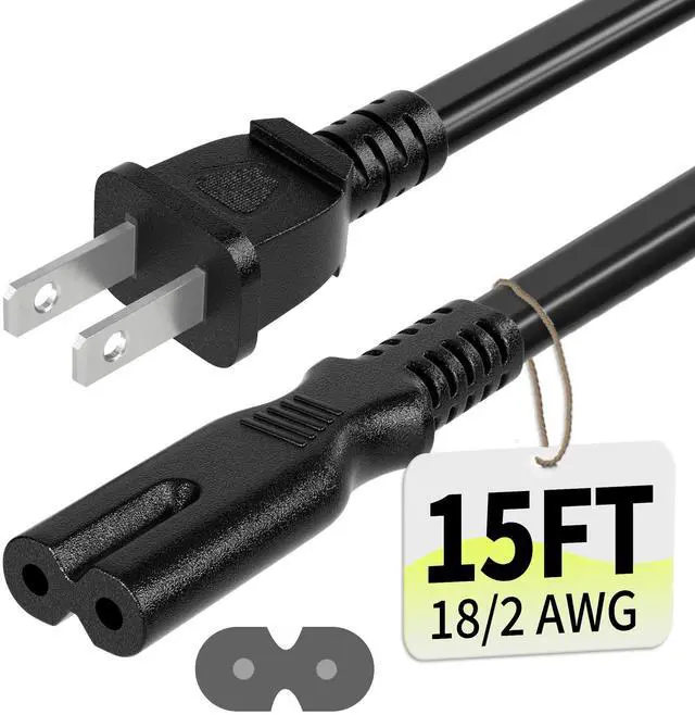 Specifications: 15 feet power cord, non-polarized 2 prong figure 8 power cord (C7 to NEMA 1-15P), 7A, 18AWG, 125V, NISPT-2, ETL listed