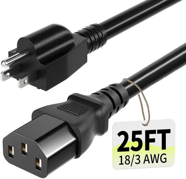 Specifications: 25 ft 3 prong Replacement AC Power Cord Cable, NEMA 5-15P to C13, 18AWG, 10A, 125V