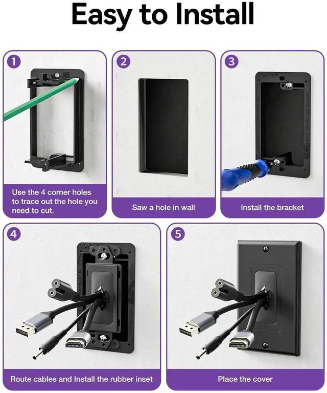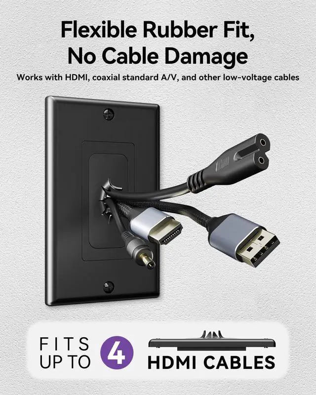 MULTIPLE WIRES PASS THROUGH: The flexible wall plate features a rubber opening that accommodates power lines, HDMI cables, coaxial cables, standard A/V cables, speaker wires, network RJ45 cables, and other low-voltage cables.
