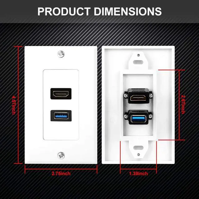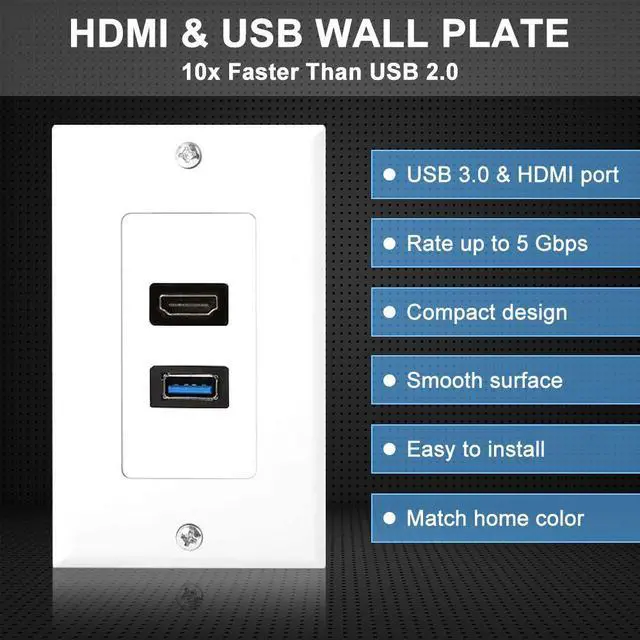 Wall Plate Include1 HDMI & 1 USB 3.0 port. USB wall plate mount. Never worry about messy cables anymore! The HDMI USB wall plate provides a clever and simple way to run your cables cleanly and neatly through the wall.
