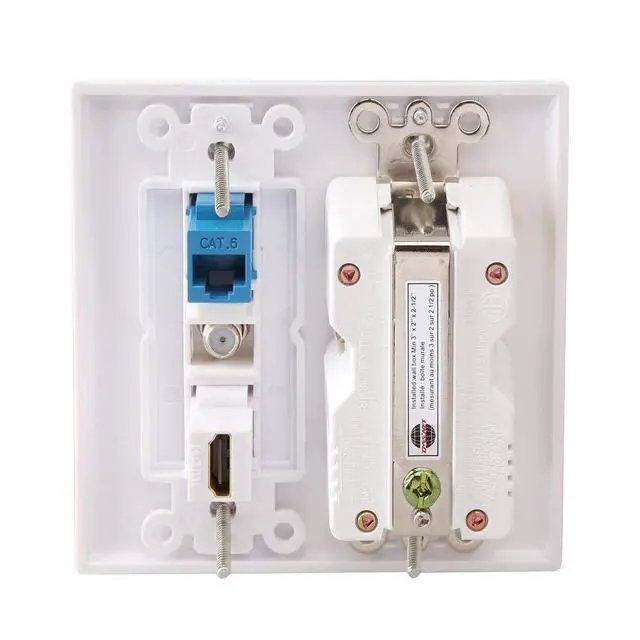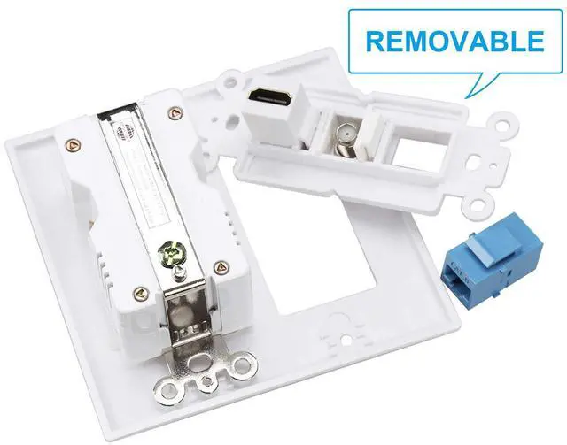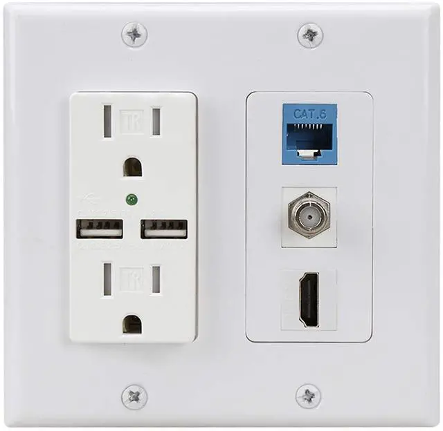 Hdmi USB Outlet Charger Wall Plate, 2 Power Outlet 15A with Dual 2.1A USB Charger Port, 1 HDMI HDTV + 1 CAT6 RJ45 Ethernet + Coaxial Cable TV F Type Keystone Face Plate White