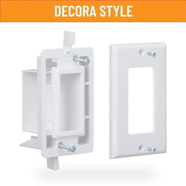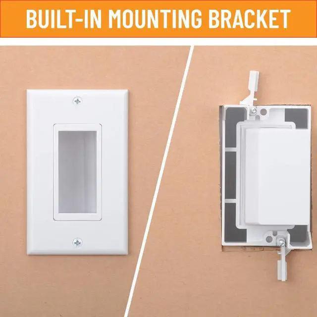 Compacted low voltage mounting bracket design - The mounting bracket is integrated with the decora wall plate for a great solution for data cords, cables, and wires outlet.