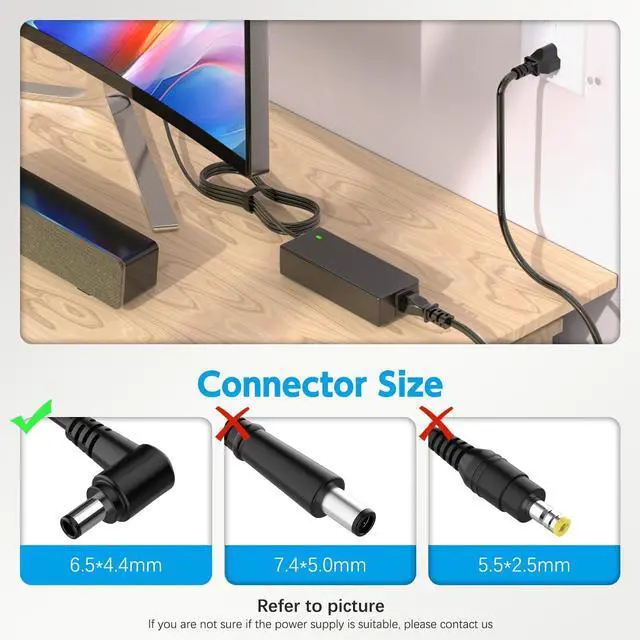 Perfect Fit Connector: 6.5mm x 4.4mm with PIN Check Your Port: Designed specifically for monitors requiring a 19V input. The connector tip is 6.5mm * 4.4mm with a Central Pin inside. This ensures a tight, secure connection that won't fall out, solving the loose connection issues of generic chargers. (Please verify your monitor's back label says "19V" before buying).