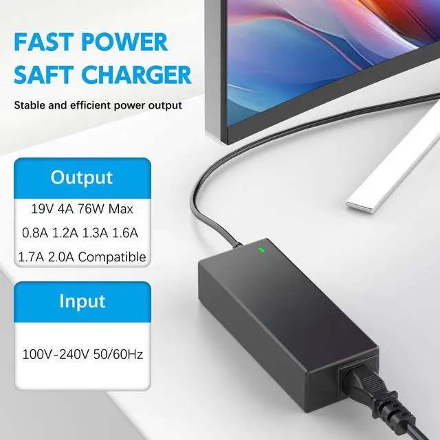 Upgraded 76W Power: Cool & Stable Output: 19V 4A (76W Max). Input: 100-240V Global Voltage. Why 4A? Our heavy-duty 4A adapter is a perfect upgrade for the original 1.3A, 1.7A, 2.1A, 2.53A, or 3.42A chargers. It runs cooler and lasts longer because it's not working at full load, providing stable power for your screen's best brightness and performance.