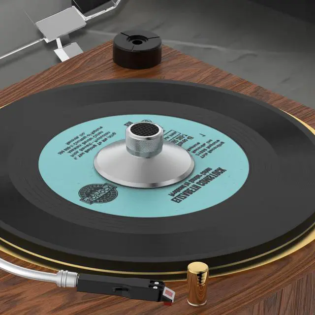 REDUCE VIBRATIONThis LP disc stabilizer, made of aluminum, holds tightly to the spindle to keep discs from shaking and reduce vibration. It also helps flatten warped records.