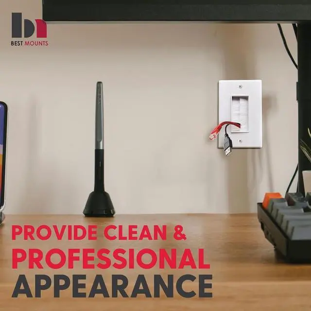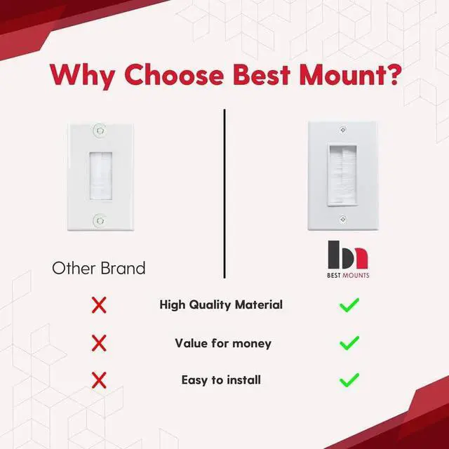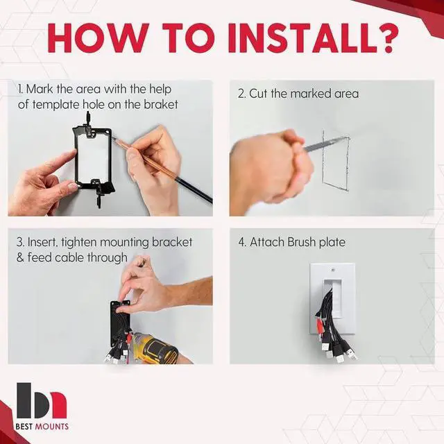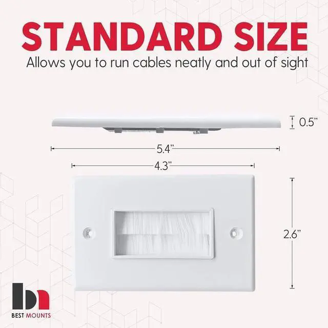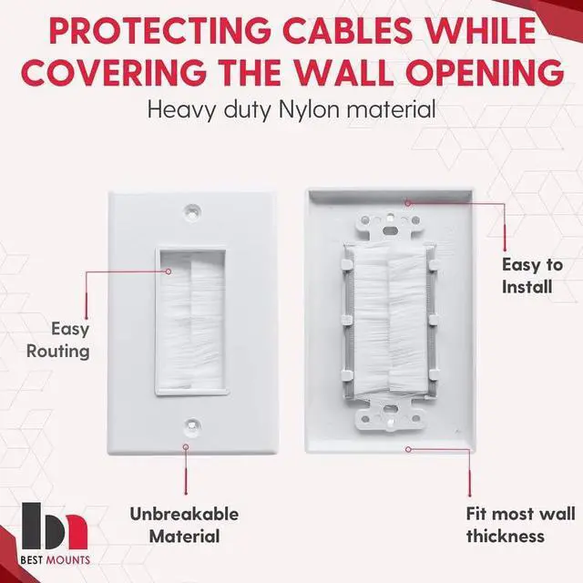 White brush wall plate conceals your TV cables, speaker wires, and Ethernet cables cleanly in the drywall.