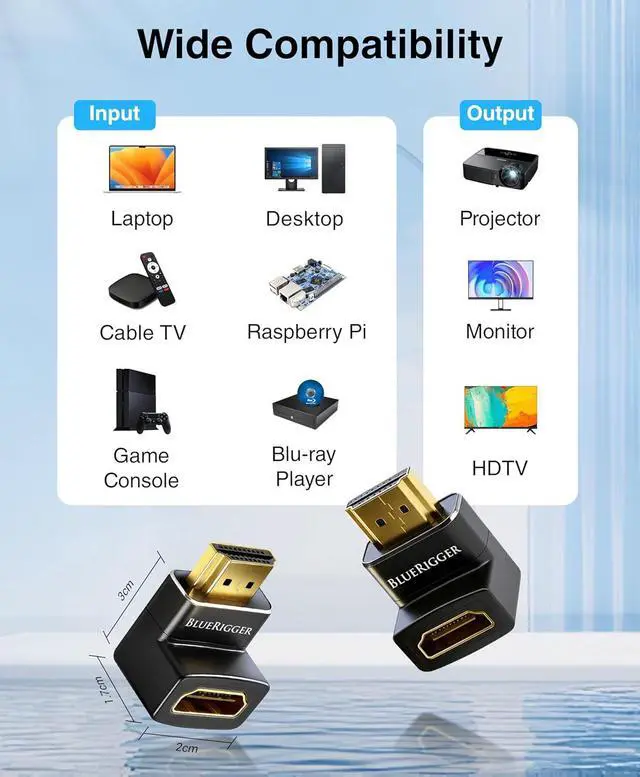 UNIVERSAL COMPATIBILITY: BlueRigger 90° HDMI to HDMI adapter for TV is compatible with HDTV Laptop PC Projector Monitor Gaming consoles XBOX PS5 PS4 PS3 TV Stick Receiver and any device with an HDMI port?