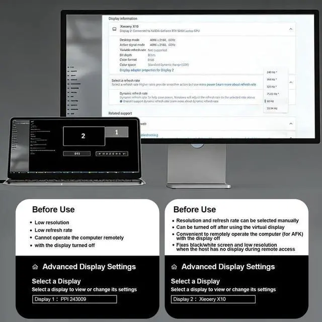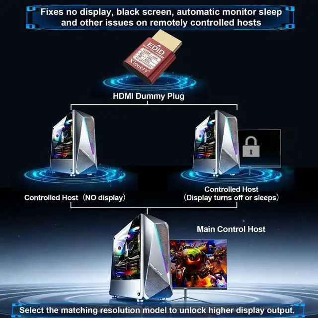 Essential for servers cloud PCs virtual machines and rack-mounted GPU nodes.?? Supports High Refresh Rates up to 240Hz Enhanced EDID library covers multiple refresh rates60Hz 75Hz 119Hz 120Hz 144Hz and 240Hzsuitable for game streaming KVM switching industrial visualization and multi-display emulation.?? Extensive HDR-Compatible Resolution Set Includes resolutions from 4096×2160 down to 800×600. Ensures compatibility with modern graphics cards older display controllers and professional computing environments.