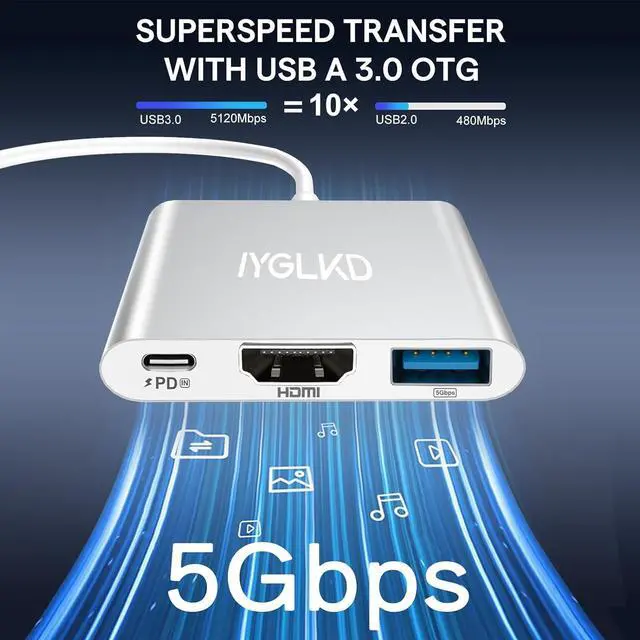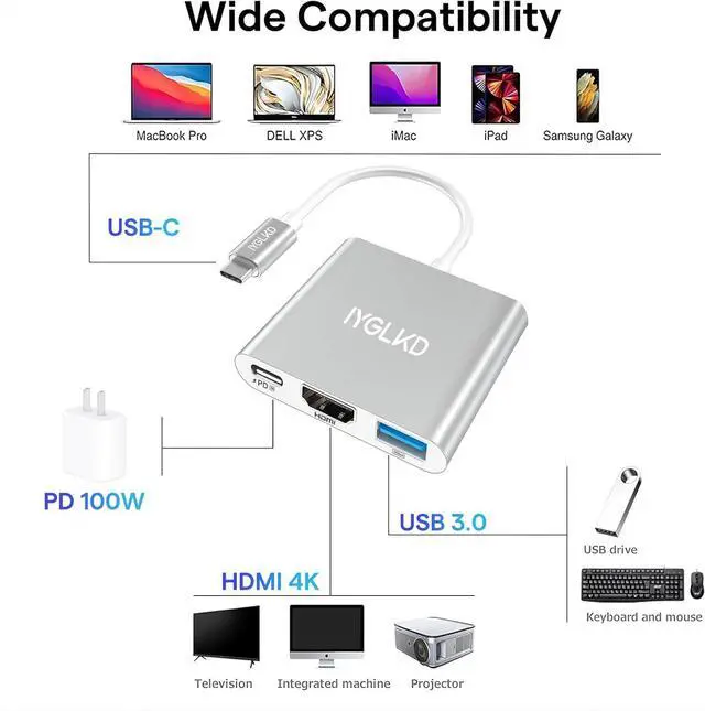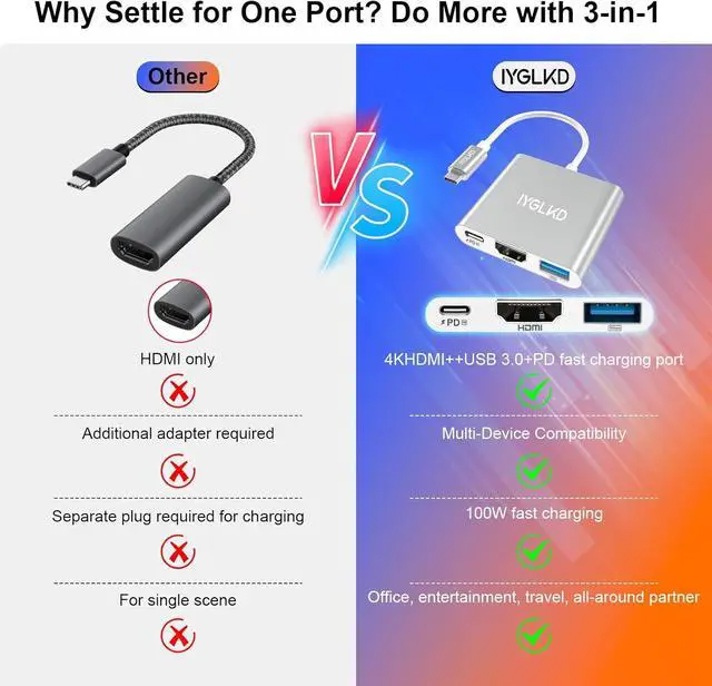 3-in-1 USB-C to HDMI AdapterUSB type-c to hdmi / usb-c/ usb 3.0 multiport adapter convenient seamlessly connects your USB-C device to an HDMI display while simultaneously providing USB-C Power Delivery charging and a USB 3.0 data port. Perfect for home theater office presentations classroom teaching and more. Enjoy fast charging crisp visuals and effortless portability all in one small pocket-sized device. Please check the details to see if there is a corresponding model. Stunning 4K Ultra HD VisualsEnhance your digital workflow with our USB-C to HDMI adapter delivering breathtaking 4K Ultra HD visuals. Perfect for watching high-definition videos editing photos or delivering impactful presentations this adapter provides exceptional performance.