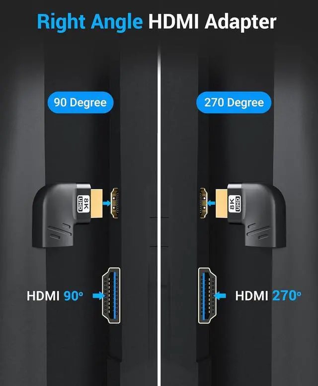 HDMI ADAPTER: BlueRigger?? 90 degree HDMI adapter supports resolution up to 8K 60Hz 4K 120Hz 2K 240Hz 48 Gbps ultra high speed eARC dynamic HDR 3D HDCP 2.3 Dolby Vision HD Dolby 7.1 and Dolby Atmos. The bi-directional HDMI male to female adapter is perfect for your home theater office or conference room? L-SHAPED 90D & 270D