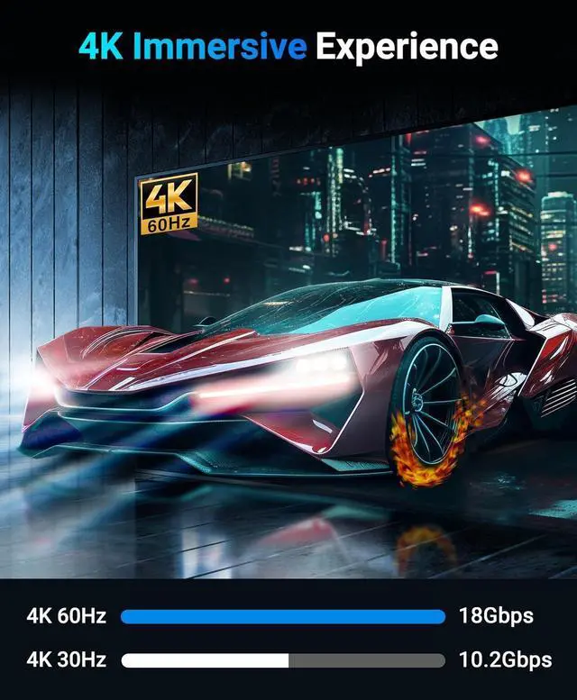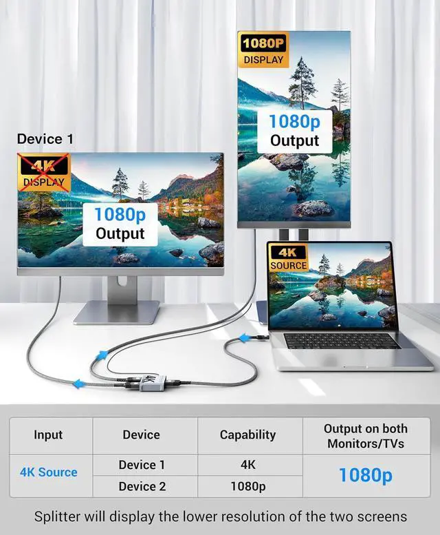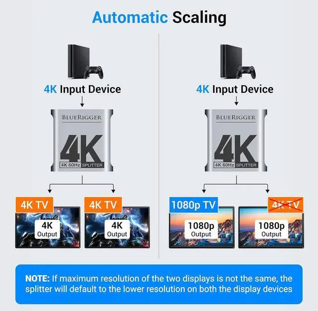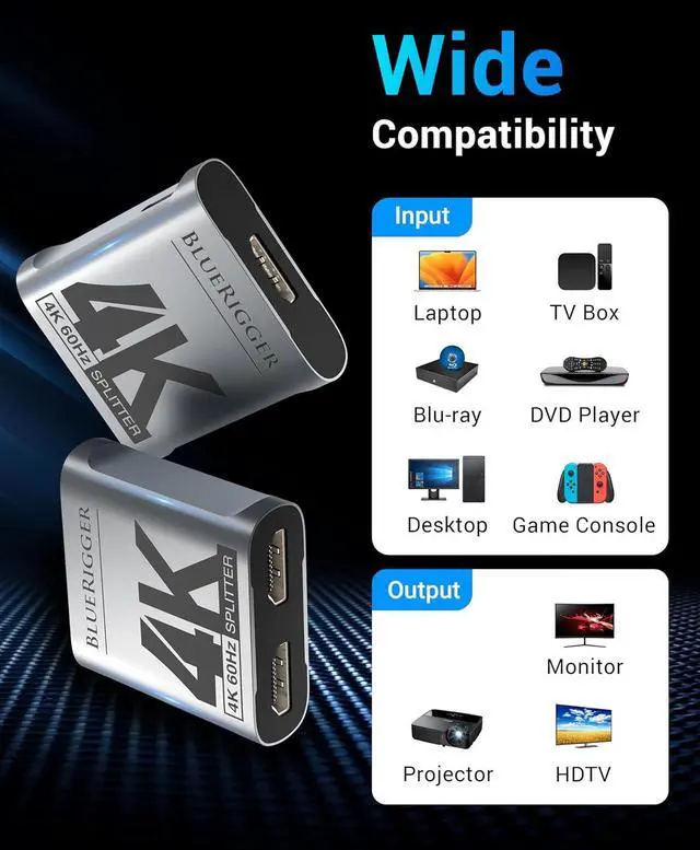 HDMI SPLITTER: BlueRigger HDMI splitter for dual monitors allows you to transmit video and audio from 1 HDMI source to 2 HDMI displays simultaneously. The HDMI splitter supports up to 4K 60Hz Ultra HD resolution 18gbps bandwidth HDCP 1.4 HDR10+ and supports audio formats DTS-HD/Dobly-true HD/LPCM/DTS/Dobly-AC3/DSD.?