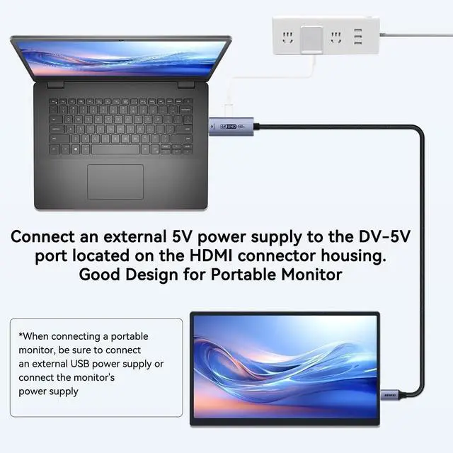 Note: Unidirectional only (HDMIUSB-C) not compatible with VR devices or USB-C laptops/phones. 4K@60Hz Immersive VisualsThe HDMI 2.0 to USB-C (Thunderbolt 3/4/5) cable supports 4K@60Hz or 1080P@120Hz with synchronized audio/video. Enjoy 3D HDR HDCP 2.3 / 1.4 for movies gaming or presentations in mirror/extend mode. Plug & PlaySimply connect HDMI cord to your source (e. g. PS5) USB-C cord to the display devices such as monitor.? For the portable monitor and AR/XR application scenarios please ensure external power supply is connected.?