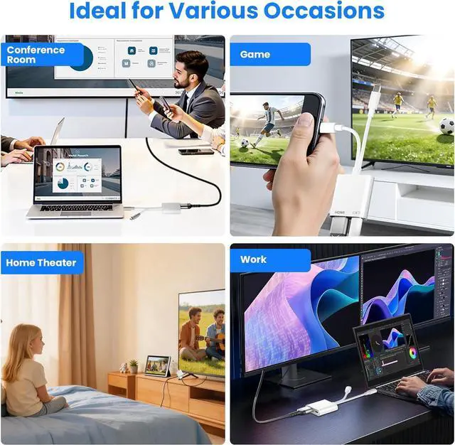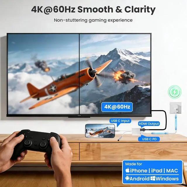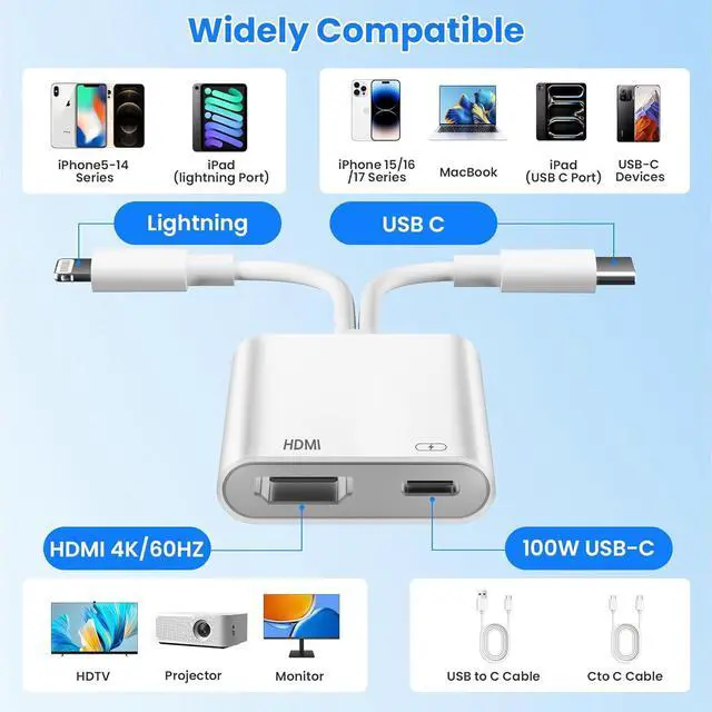 ? 2-in-1 Dual Port Design & MFi CertifiedExperience the ultimate convenience with our 2-in-1 Lightning to HDMI Adapter and USB-C to HDMI Adapter combo. Built with an official MFi-certified chip it ensures flawless stability with your iPhone iPad and a wide range of USB-C devices like Galaxy Google Pixel and MacBooks. This versatile Lightning Digital AV Adapter? alternative is your all-in-one solution for screen mirroring and extending.?? Ultra HD 4K@60Hz & Crystal Clear AudioExperience true-to-life Ultra HD 4K@60Hz resolution for USB-C devices with this USB C HDMI adapter delivering incredibly sharp smooth visuals and crystal-clear audio on the big screen.