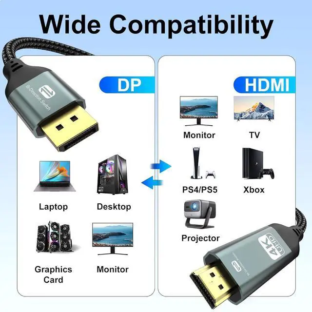 Compatibility: Universally compatible with DisplayPort source devices like computers and NVIDIA graphics cards (RTX 5090 RTX 4090 RTX 4080 Ti RTX 4070 Ti RTX 3080 RTX 3090) as well as AMD graphics cards (Radeon RX 6900 XT RX 7900 XT). Also supports HDMI source devices such as laptops Switch Switch 2 PS4 PS5 and