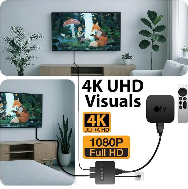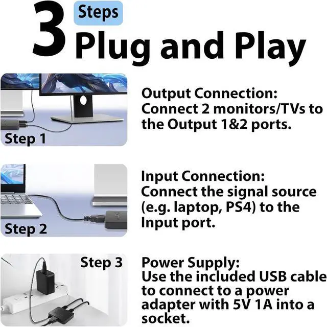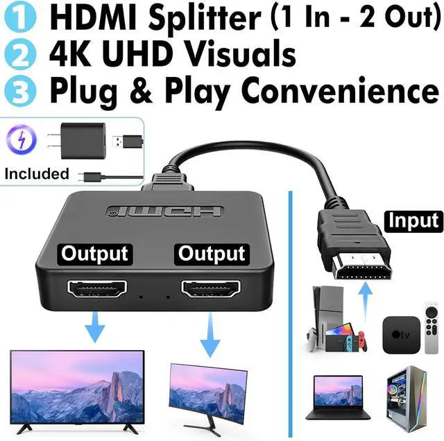 Mirror-Mode Only HDMI Splitter HDMI Signal to 2 Displays duplicates one HDMI input into 2 outputs for mirrored video and audio on dual screens. DOES NOT support extended display or independent dual-screen operation. 4K UHD Resolution Support Delivers crisp ultra high-definition visuals up to 4K@30Hz far beyond standard HD. Enjoy crystal-clear detail for movies games and presentations with our hdmi hub for multiple monitorsPlug & Play Convenience No drivers or software required: connect HDMI device & power with the included 2.5 ft USB power cable and adapter. Connect devices in the following order for optimal performance: HDMI input HDMI output USB power supplyWide Compatibility Works with most