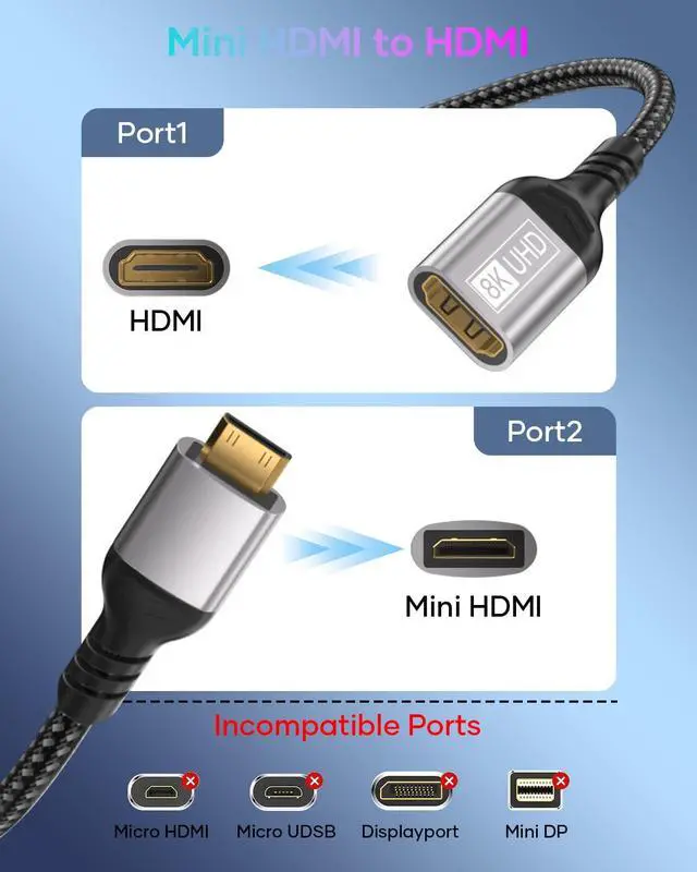 Important Note - Mini HDMI to HDMI Adapter supports bidirectional transmission features. The first thing to confirm is that your device has a Mini HDMI port (Mini HDMIMicro HDMIMicro USB) Stunning 8K & Smooth 4K - Enjoy sharp 8K@60Hz and lag-free 4K@120Hz when connecting your camera Raspberry Pi or tablet to a monitor or TV. It is nice for gaming editing or presentationssay goodbye to small screens and laggy visuals.