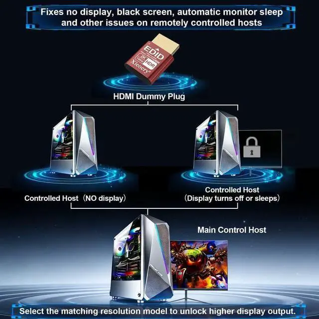 Ideal for game streaming multi-monitor virtualization KVM stability and GPU initialization in headless environments.?? Plug-and-Play for All Major Platforms Works instantly with Windows macOS Linux Proxmox VMware NUCs mini PCs industrial computers KVM switches and cloud PCs. No driver installation requiredsimply plug it in to prevent resolution fallback or GPU downclocking.?? Broad Compatibility with Integrated EDID Library Features an extended EDID database covering common 2K Full HD HD+ and legacy modes. Ensures consistent resolution detection across modern GPUs and older hardware maintaining system stability for 24/7 operation.