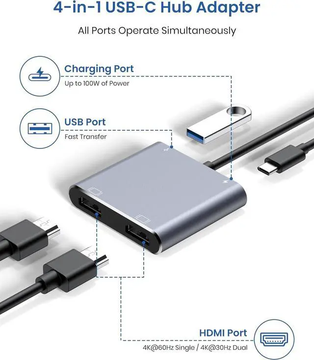 USB Connectivity: This dual HDMI adapter supports up to 100W fast charging (charger not included) and includes a USB-A 2.0 port for seamless connection with a wide range of peripherals like hard drives printers keyboards and mice. Adjust the default audio output in system preferences if sound issues arise.