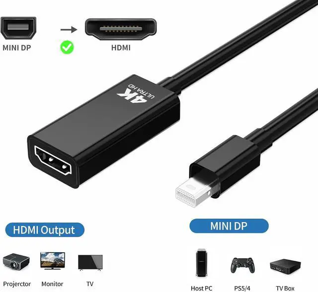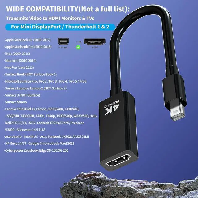 4K@60HZ Mini DisplayPort to HDMI adapterEnjoy ultra-clear 4K@60Hz visuals with support for 1440P@144Hz and 1080P@240Hz high refresh rates. Delivers lossless 7.1 / 5.1 multi-channel audio DTS-HD and 3D surround sound. (Not compatible with Thunderbolt 3/4 USB or Type-C ports. )Universal CompatibilityWidely compatible with mini DP and Thunderbolt 1&2 devices such as MacBook Air (before 2017) MacBook Pro (before 2015) iMac (2009-2015); Surface Pro/Pro 2/Pro 3/Pro 4 and Surface 3. Works with major monitors ( etc. ) and projectors. DurabilityBuilt with 24K gold-plated connectors plastic shell and braided cable. Features integrated molding for enhanced corrosion resistance and long-lasting performance.