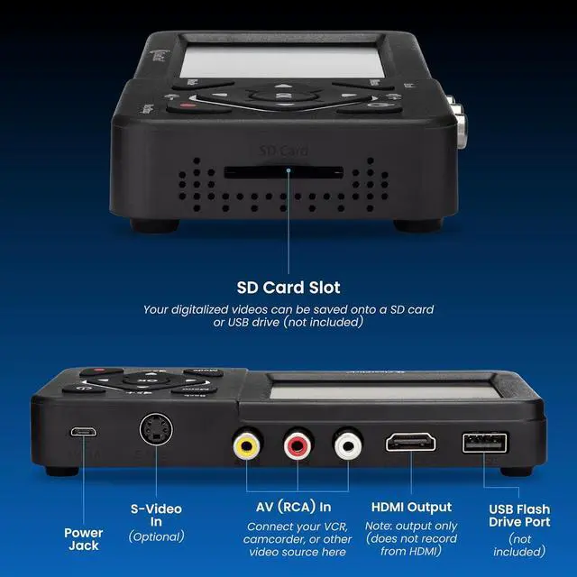 Button (Recording Resolution: SD 640x480 or 720x480 Pixels. Does Not Upscale To HD. Does Not Record From Modern HDMI Sources. )Record and Digitalize Video From VHS VCR's DVD Players DVR's Camcorders Hi8 & Retro Gaming Systems (IMPORTANT: A WORKING VCR/CAMCORDER AND WORKING VIDEO TAPES ARE REQUIRED; CONVERTER DOES NOT PLAY VIDEO TAPES BY ITSELF)No Computer or Software Required - Just Hook It Up & Start Recording - Records Videos Directly Onto USB Flash Drive or SD Card (REQUIRED NOT INCLUDED; 512 GB or less)What's New In The Video2Digital Version 2.0 (Second