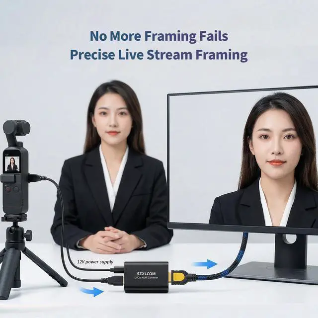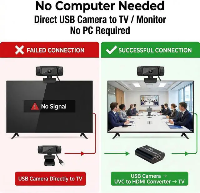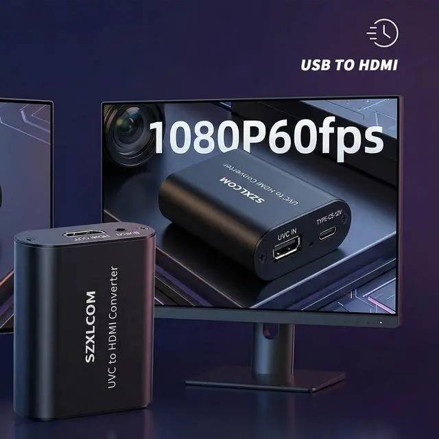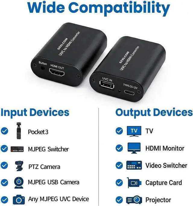 ? Converts UVC USB Cameras to HDMI This UVC to HDMI converter transforms compatible UVC USB cameras into a clean HDMI output source. Designed for use with HDMI monitors TVs projectors video switchers and capture cards in live streaming conferencing and production environments? 1080P 60Hz Smooth Output Supports up to 1920×1080@60Hz with stable low-latency performance for real-time HDMI output and monitoring. Ensures smooth video without noticeable delay? MJPEG Cameras Only Please Check Before Purchase Compatible with UVC USB cameras that support MJPEG video format only. Not compatible with YUY2/YUYV NV12/NV21 RGB H. 264 or H.