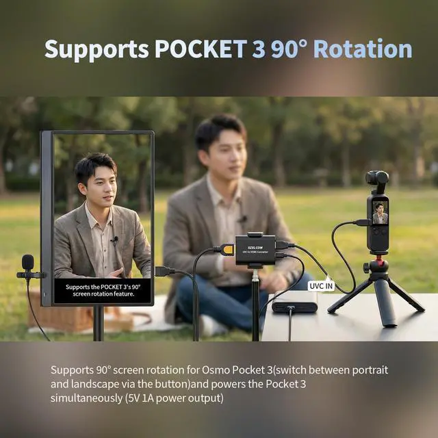 265. Orientation switching works with supported formats (e. g. Osmo Pocket 3)? HDMI Output with Embedded UAC Audio Converts both UVC video and UAC audio into HDMI output with embedded audio. Allows USB cameras with built-in microphones to output synchronized video and audio through a single HDMI connection? Plug & Play with Power Support for Stable Operation Provides 5V/1A power output to connected USB devices. Some high-power cameras may require an external power adapter (up to 12V) for stable performance. Durable aluminum housing ensures reliable operation? Designed for HDMI-Based Production Workflows Connect your USB camera directly to HDMI switchers capture cards or encoders.