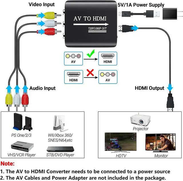 Widely Used: This AV to HDMI Adapter is widely applied to PS1 PS2 PS3 Xbox N64 WII STB VHS VCR DVD Players and other devices with standard composite AV input.