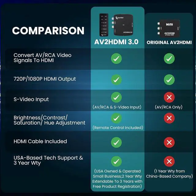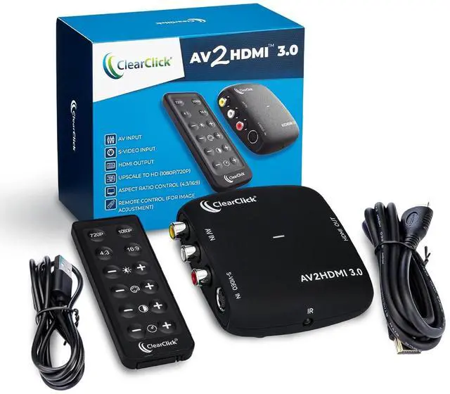 (Important Note: Does NOT Downscale HDMI to RCA/AV/S-Video)NEW! Remote Control Included - Fine Tune Your Video's Image Quality By Adjusting Brightness Contrast Saturation Hue Resolution (1080P or 720P) Aspect Ratio (Preserve Original 4:3 Look with Black Bars or Stretch To 16:9 HD Widescreen To Fill Your TV Screen)NEW! S-Video Input - Allows S-Video Input From Camcorder VCR DVD Player & More - Providing The Highest Possible Video Quality From These Sources (S-Video Cable Not Included - RCA/AV Cable Required For Audio Signal)Includes 2-Year Warranty & Tech Support from ClearClick a USA-Based Small Business (Extendable to 3 Years for Free - See User's Manual)