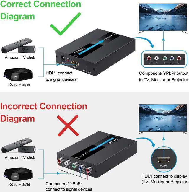 Component resolutions output: 480i (60Hz) 576i (50Hz) 480p (60Hz) 576p (50hz) 720p(50/60Hz) 1080i/p(50/60Hz). Choose the best output resolution by the resolution switch button. Plug and play. Easy to install and operate.