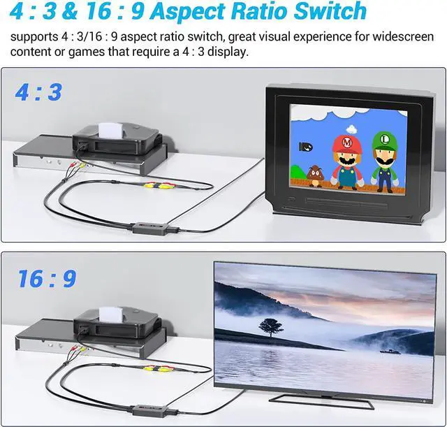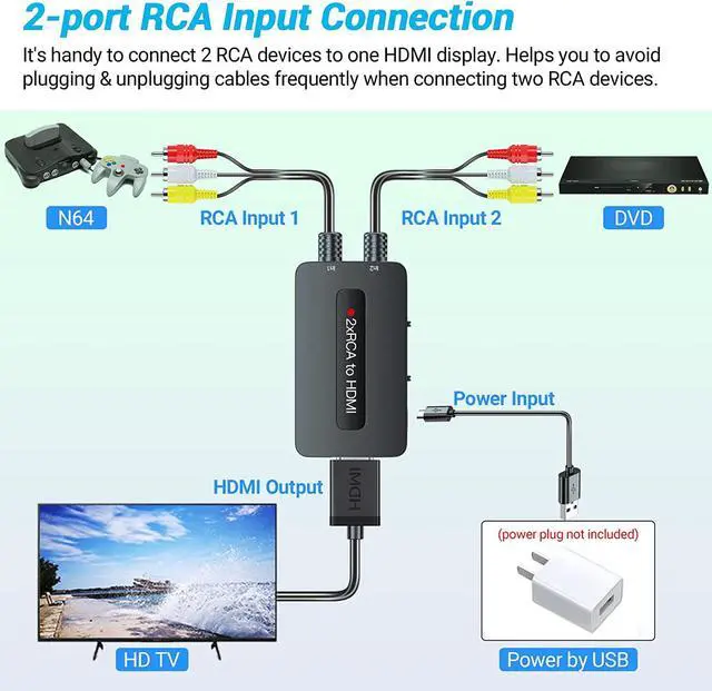 3/16: 9 aspect ratio switch great visual experience for widescreen content or games that require a 4: 3 display. 2 F-F RCA Couplers IncludedThis two Composite to HDMI adapter includes 2 RCA female to female couplers so that you can connect any devices with male or female RCA output without any issues. Cost-Saving Our 2 x RCA to HDMI converter includes all cables needed for connection (power plug not included) users don't need to purchase HDMI & RCA cables separately.