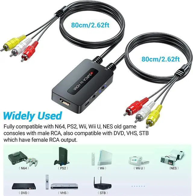What you get: 1 x dual port AV to HDMI converter; 2 x RCA female-female couplers; 2 x RCA cables; 1 x HDMI cable; 1 x USB power cable; 1 x user manual. Widely Used This dual port AV to HDMI converter has super compatibility. Fully compatible with old game consoles with male RCA also compatible with DVD VHS STB which have female RCA output.