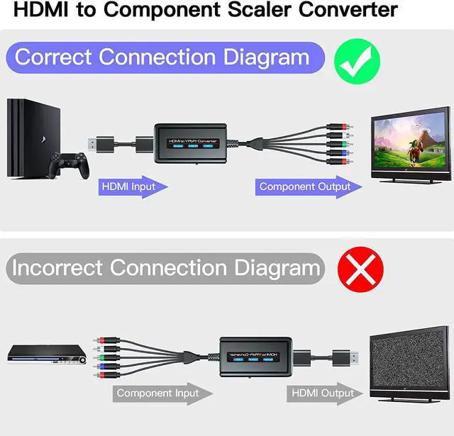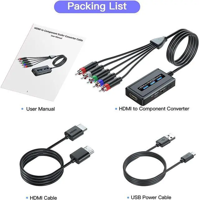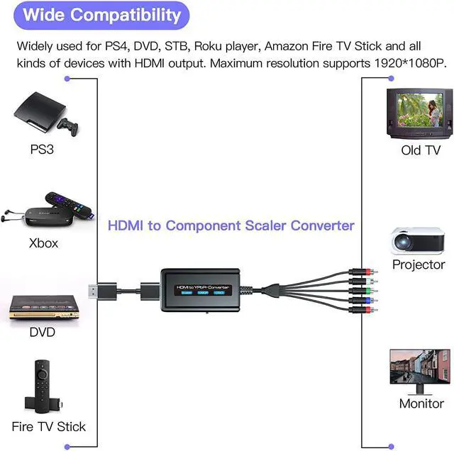Package list contains: 1 x HDMI to RGB scaler converter 1 x integrated Component cable( 0.8 m) 1 x HDMI cable (1m) 1 x USB power cable( 0.8 m) 1 x user manual. Wide CompatibilityThis HDMI to YPbPr converter converts HDMI signal into Component video and analog stereo R/ L audio signal. It allows you to connect HDMI sources to a Component display such as HDTV monitor projector ect. Widely used with Blu-ray DVD STB PS3 PS4 Fire TV Stick PC and all kinds of devices with 1080P HDMI output.