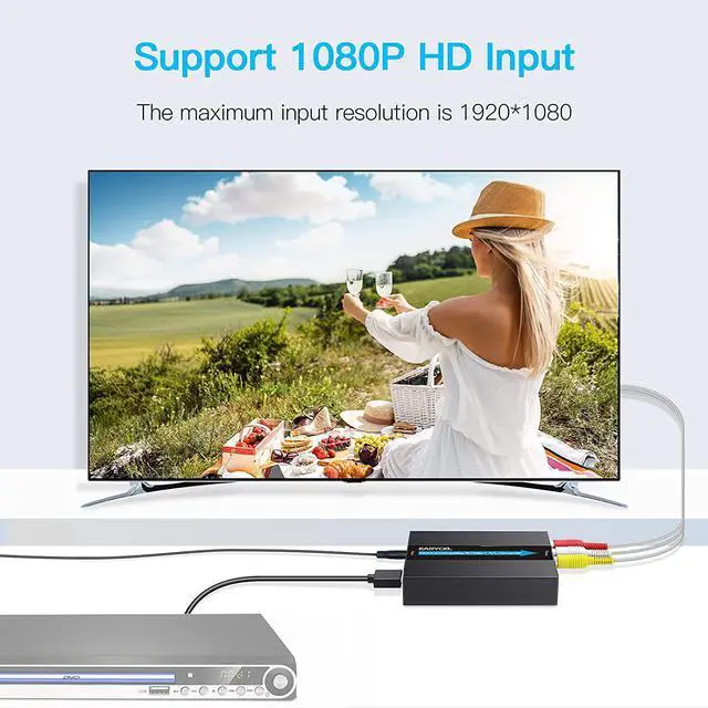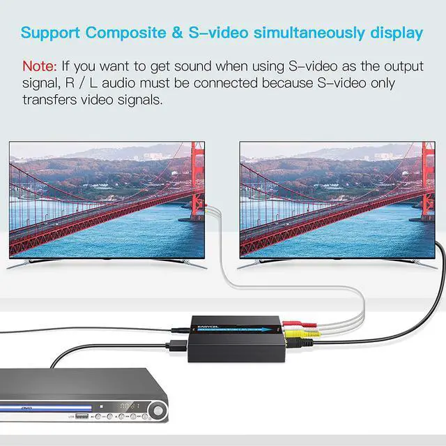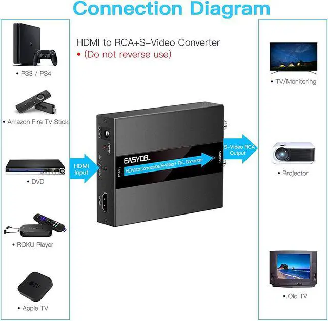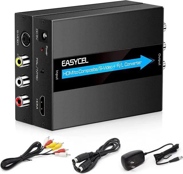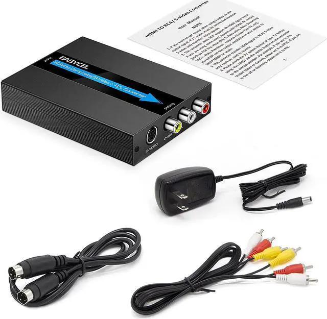 Note: This HDMI to RCA s-video converter does not support HDMI 4k. Plug and play EASYCEL HDMI to Composite AV CVBS converter easy to use no software required. Portable and flexible. Package List 1 x HDMI to Svideo RCA Converter 1 x Power Adapter 1 x Composite Cable 1 x S-Video Cable. 1 x User manual
