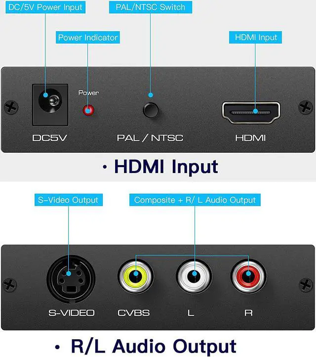 HDMI to S-video RCA ConverterThis HDMI Svideo RCA Converter converts HDMI signal into S-video + RCA & L / R audio simultaneously. Enables you to play HDMI signals on older TVs monitors and projectors. Wide Compatibility This HDMI RCA Svideo adapter is fully-compatible with HDMI TV Sticks DVD PS3 PS4 HD CCTV Camera HD DVR and other video sources that have HDMI outputs. Full HD 1080P InputThe maximum input resolution of this HDMI to RCA Svideo converter is HDMI 1.3 1080P.