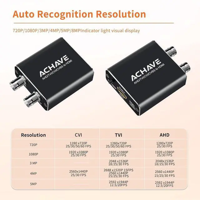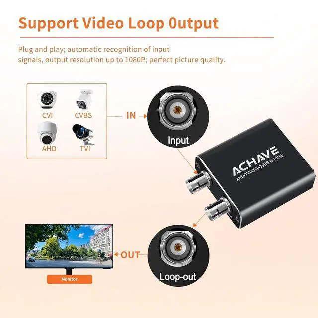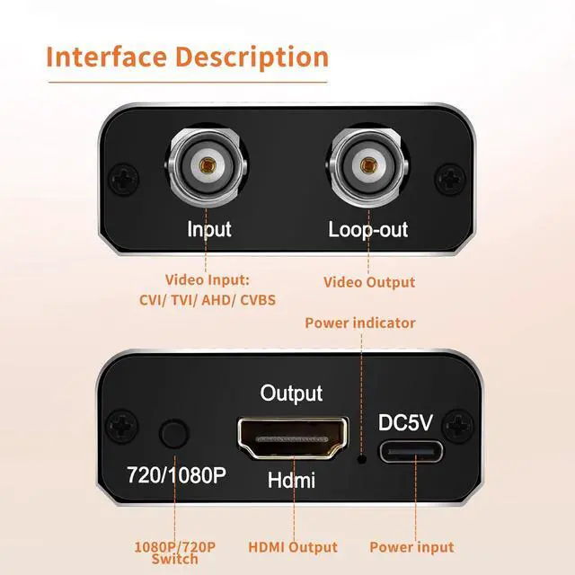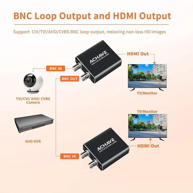 You Get: 1x AHD/ TVI/CVI/CVBS to HDMI Converter 1x 5V/1A Power Adapter and Cable 1x User Manual.