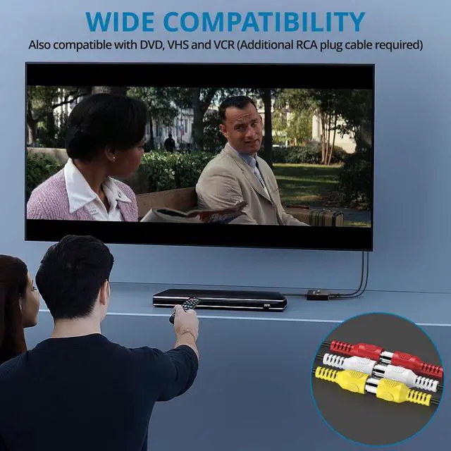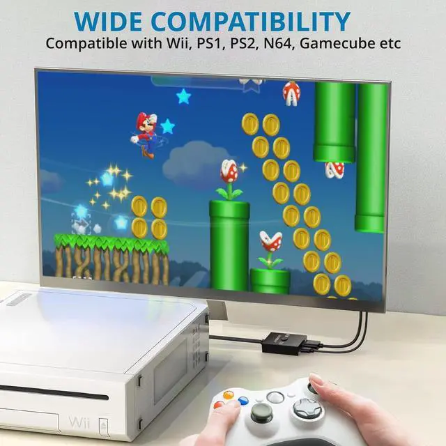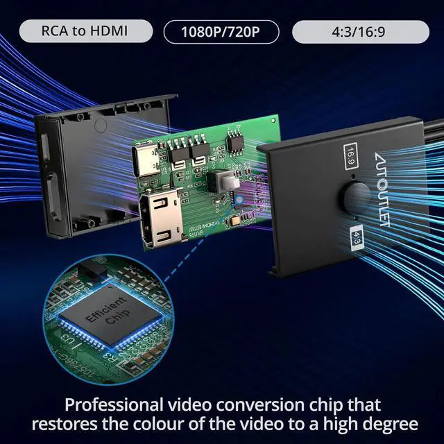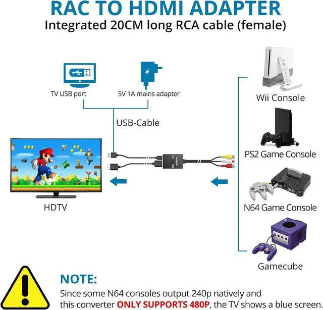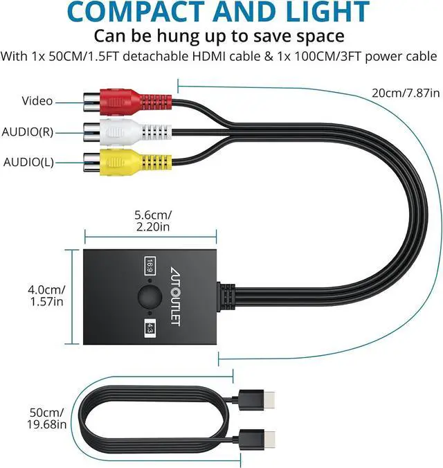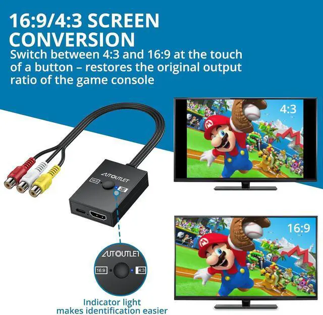 Enhanced Retro Gaming ExperienceThis RCA to HDMI converter brings classic video games to life on modern HDTVs supporting 1080P (60Hz) and 720P (60Hz) output. Relive your childhood memories with retro consoles like PS1 PS2 Wii and N 644:3 / 16:9 Aspect Ratio SwitchThis AV to HDMI hdmi converter is featuring a convenient aspect ratio switch easily toggle between 4:3 for classic game consoles or 16:9 for widescreen viewing. Enjoy games as they were originally designedReady to Use with Included HDMI CableThis av to hdmi adapter comes with a 50cm ( 1.5 ft) HDMI cable so you dont need to buy extra cables.