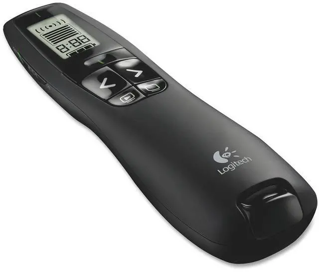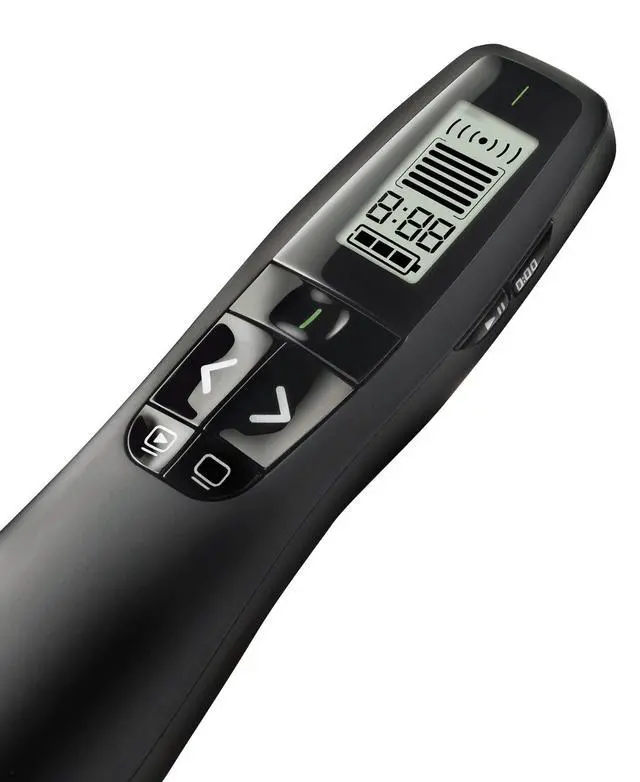 Your slideshow presentation is ready. The room is full. And with your wireless Logitech Professional R800 Presenter in hand, you're set to grab hold of your audience. Aim the laser pointer at the screen and everyone sees your point. The brilliant green laser light is strong enough to be seen clearly, even across a large conference hall. Move smoothly and confidently from slide to slide with intuitive one-touch controls. Focus on your presentation, instead of the clock, with an easy-to-set timer and vibrating alerts to help you manage your time. And with no wires or cables, there's nothing to hold you back from moving around and working the room. Whether you're making a sales presentation in a hotel ballroom or giving a professional lecture in a 2,000-seat auditorium, you'll get and keep their attention from first slide to last.