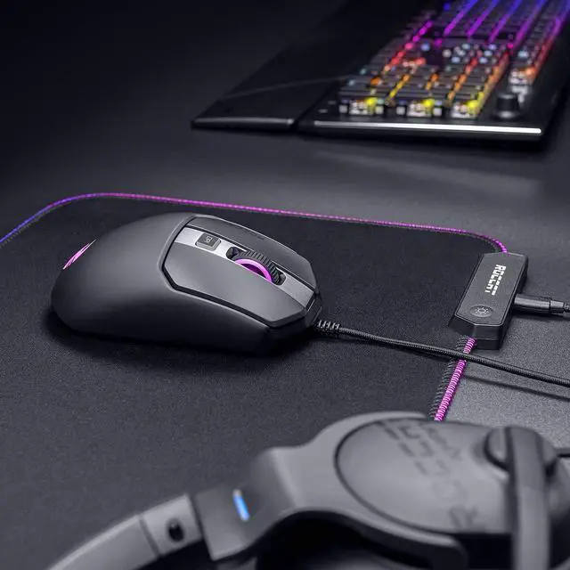 Details: The ROCCAT Kain gaming mouse features a comfortable ergonomic shape and Titan Click technology for vastly improved click balance and precision. The accurate ROCCAT Owl-Eye optical sensor is adjustable up to 16 000dpi and lets you achieve perfect tracking. The AIMO illumination eco-system provides RGB lighting and LED effects customizable in 16.8 million distinct colors. The overhauled Titan Wheel 2.0 scroll wheel unlocks solid clicks and responsive scrolling steps. ROCCAT-exclusive Omron switches last for up to 50 million clicks.