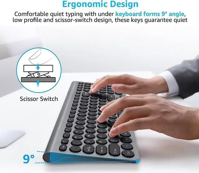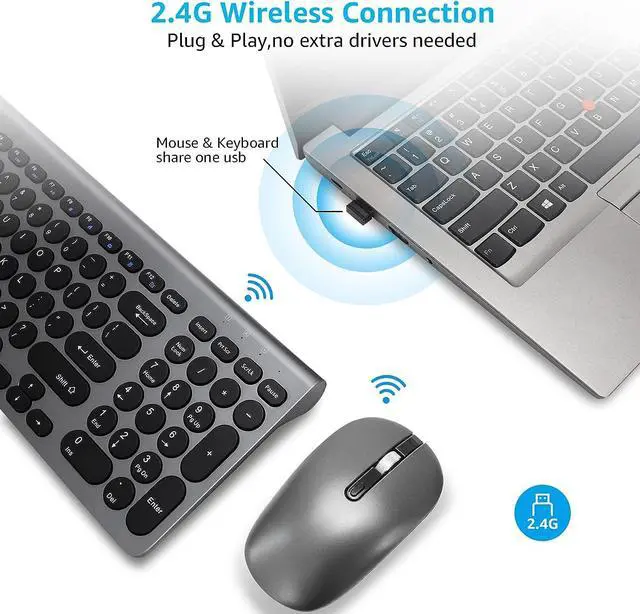 ^^Reliable Wireless Connection: Connect to a computer with 2.4G wireless technology. The wireless keyboard and mouse combo works from up to 33 feet (10 m) away with one tiny USB receiver, with fast data transmission wireless technology. The wireless plug-and-play keyboard and mouse can be connected to your configuration at any time, making work simple and easy. ^^Contoured Comfort Design The wireless mouse\u2019s contoured shape are designed to fit comfortably in either your right or left palm, 3DPI(800/1200/1600) enhanced tracking and precise cursor control keep you in command. The tilt-legs offer the perfect typing angle