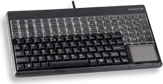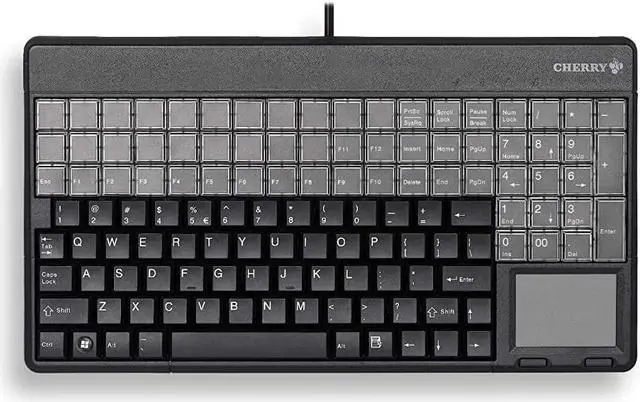 SPOS Black QWERTY TP Black 14" USB keyboard with touchpad. US Intl 123 position key layout with 20 additional keys. 123 programmable and 60 relegendable keys. IP 54 spill & dust resistant key field. Includes 'CHERRY Tools' and UPOS support. Lasered keycaps