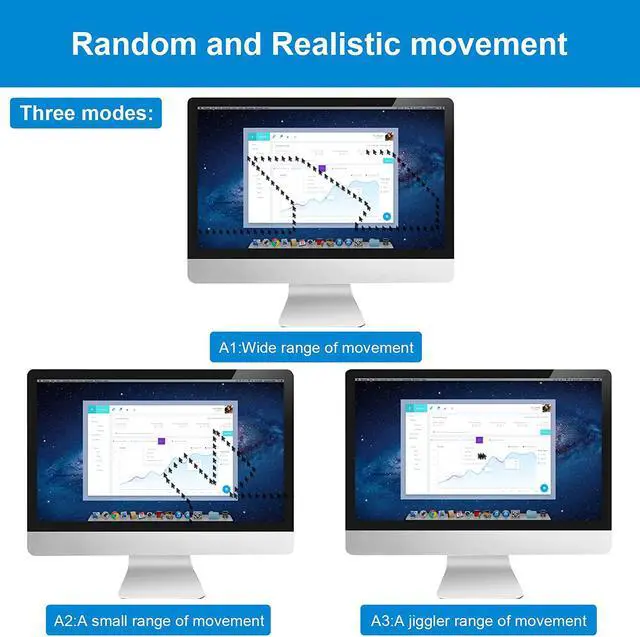 • 3 modes and multi-trackThis upgraded mouse mover provides three modes: A1, A2, A3, which makes the cursor move automatically in different trajectories and amplitudes, The three modes are mainly reflected in the different moving speed of the cursor, and the moving track is random realistic.