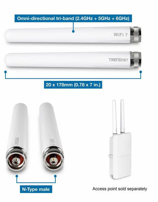 antennas supporting 2.4GH z, 5GHz, and 6GHz radio transmissions for both WiFi 7 and legacy bands. Provide reliable, blanket