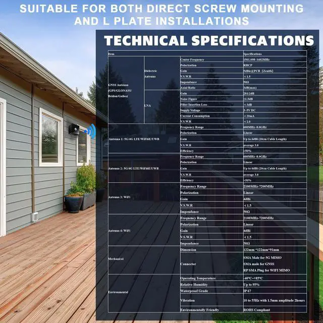 • Cellular/WIFI GNSS FREQUENCY: Cellular 5G/4G LTE/3G WiFi6E/UWB :600~8.0GHz; GNSS Wifi7/WiFi6E/Bluetooth/Zigbee: 2100MHz~7200MHz. Ideal for signal reception of GSM LTE/3G/4G/5G Cellular MIMO GNSS Wifi7/WiFi6E/Bluetooth/Zigbee wireless devices.