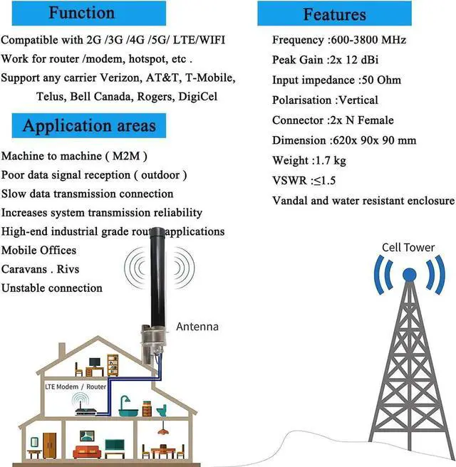 Use Flow: This ( 5g mimo antenna outdoor) just plug and play, not required any setup. You disconnect the original antenna on the router device, connect one end of the cable to that Jack, and then fix the antenna outside the house and connect the other end of the cable to the antenna.
