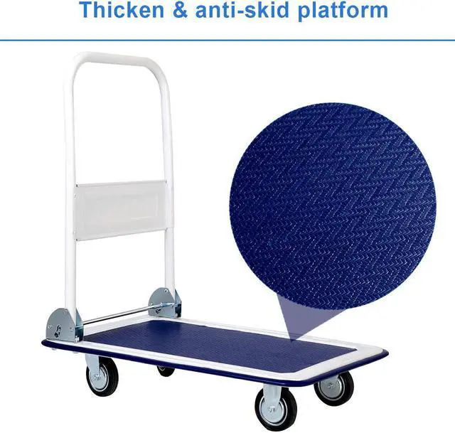 Haul around groceries, furniture, luggage or office supplies effortlessly with the four-wheeled models cart, this product is the wonderful choice for moving heavy goods. The Flat deck makes it easy to load and unload. Four wheels provides ample stability for this heavy load when on sidewalks, pavement, at home or in office corridors. The 2 swivel caster and 2 regular caster wheels design, can be easy to move and support up to 300 pounds for long, heavy hauls. It is a smart choice for your home or business.