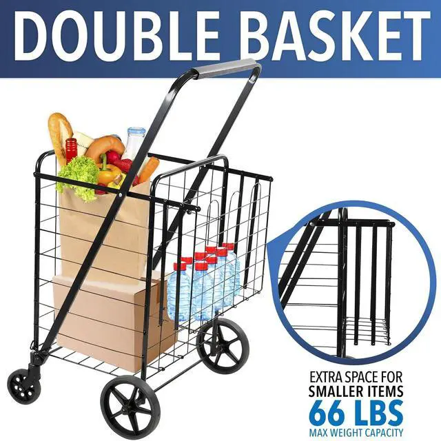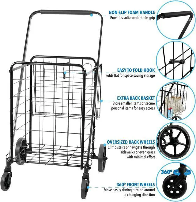 Made from rust-resistant metal and rubber wheels. Has 66 lb carrying capacity. Our utility cart is stronger than competition’s at the same price point. We also provide a bungee cord to ensure the load is secured to the trolley. The trolley folds down to couple inches thick for easy storage. The wheels and the nose folds in and the handle retracts for convenient and compact storage in your vehicle or anywhere around the house and the office.