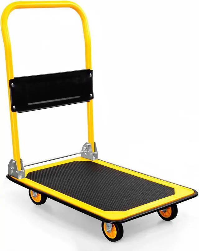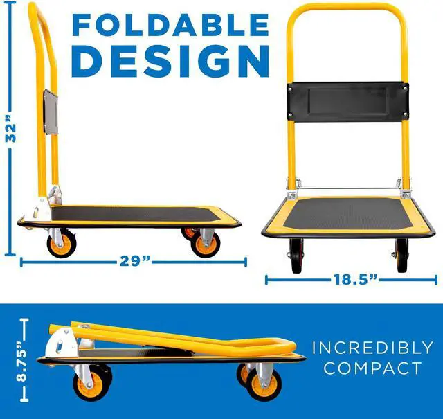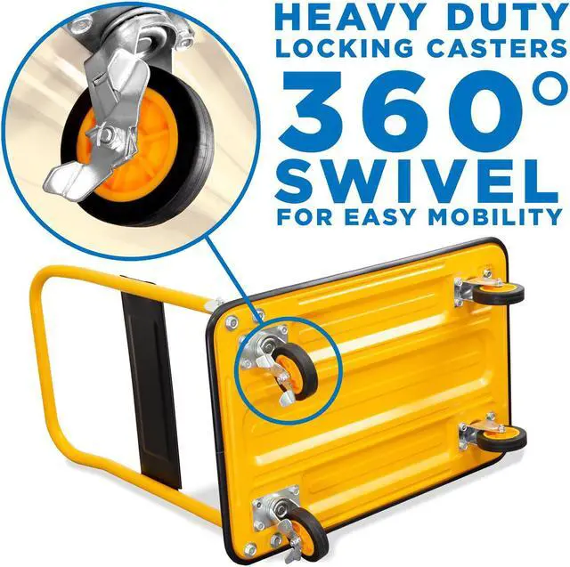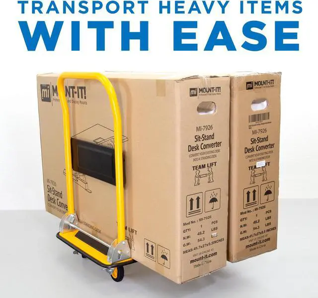 The Mount-It! MI-920 combines both a heavy-duty build and a folding design, making it easier for portability and storage. The heavy-duty construction allows it to carry up to 330 lbs and features two caster wheels with 360° swivel for easier mobility in a variety of spaces. The well-built rubber wheels make for a smooth roll. Carry more at once with this heavy-duty hand cart platform and save your back from over-exertion.