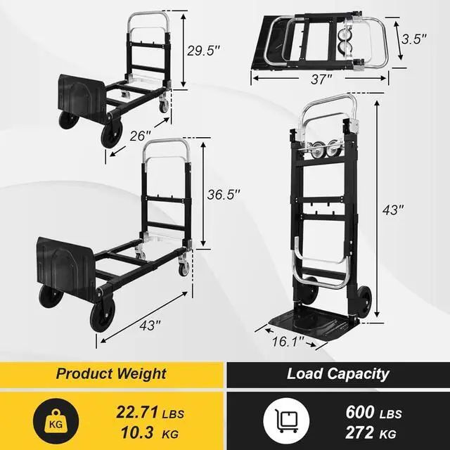Various sizes and forms: Our 3 in 1 convertible hand truck adapts to different cargo sizes and height requirements. Folded dimensions are 37L x 15.5 W x 3.5 H, Two-wheel trailer measures 38 L x 15.5 W x 9.5 H, four-wheel dolly measures 38 L x 36.5 W x 15.5 H