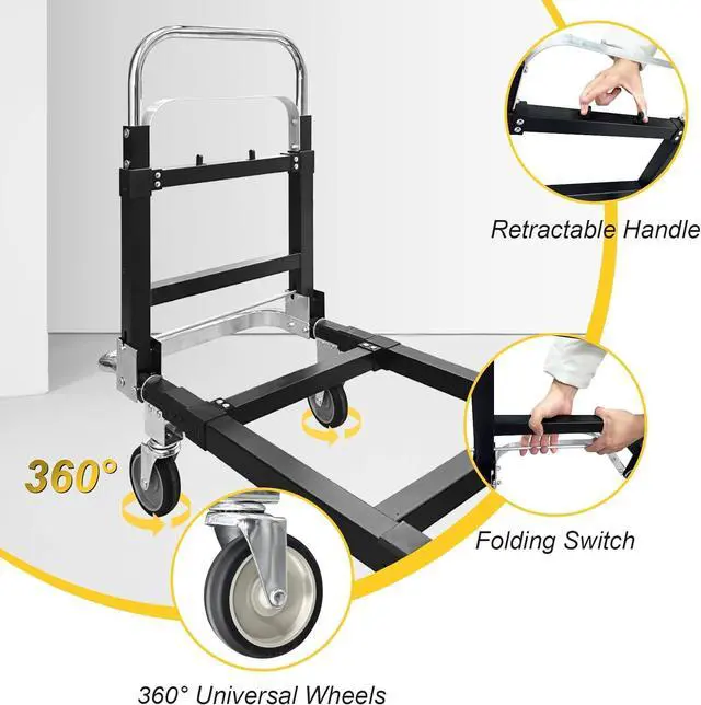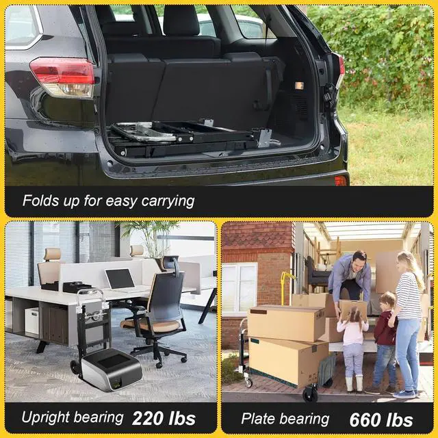 Heavy duty and durable: Our collapsible carts are made of reinforced aluminum and forged steel, with a weight capacity of 600 pounds for a four-wheeled cart and 300 pounds for a two-wheeled cart, with two universal wheels to handle any loading job.